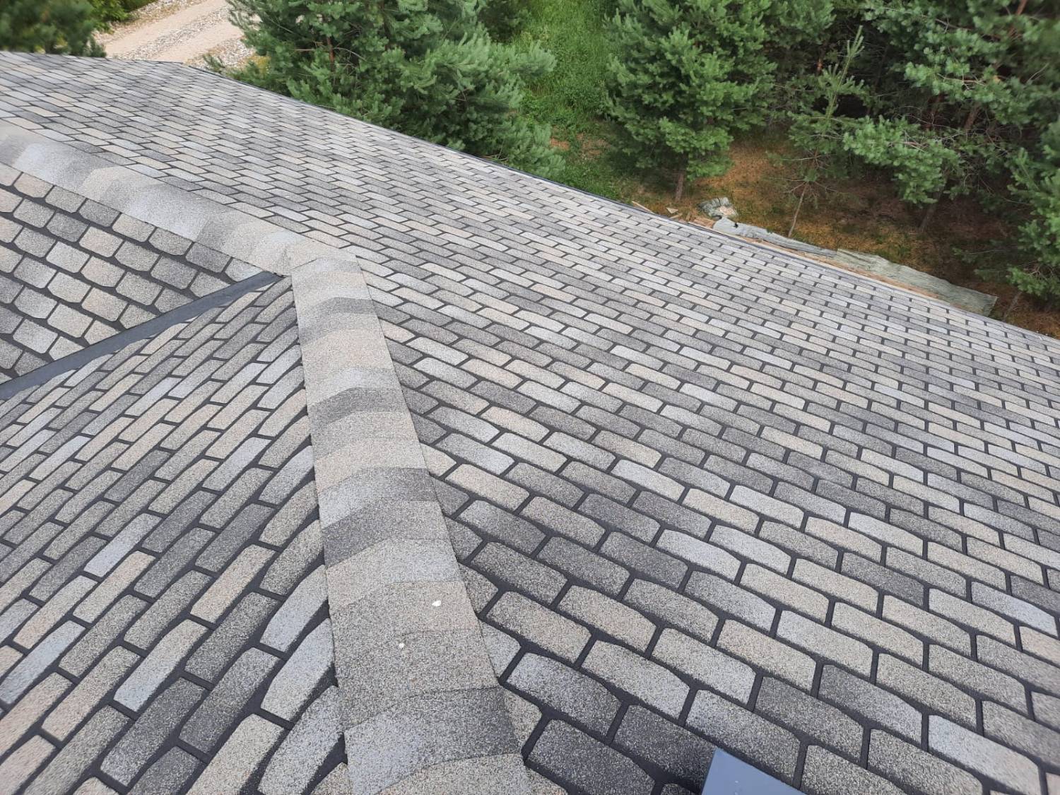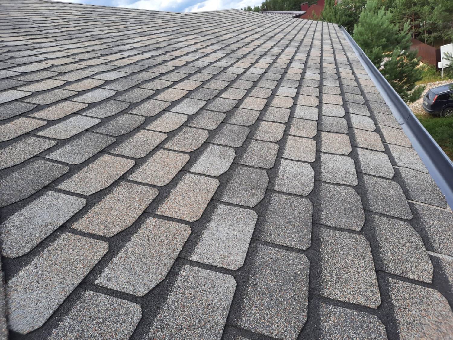 Комплексный монтаж гибкой черепицы DӦcke с установкой дымохода и вентиляции. Выполнены все этапы кровельных работ: от обрешетки и гидроизоляции до окончательной укладки черепицы, с полной интеграцией систем дымохода и вентиляции для надежной и долговечной эксплуатации крыши.