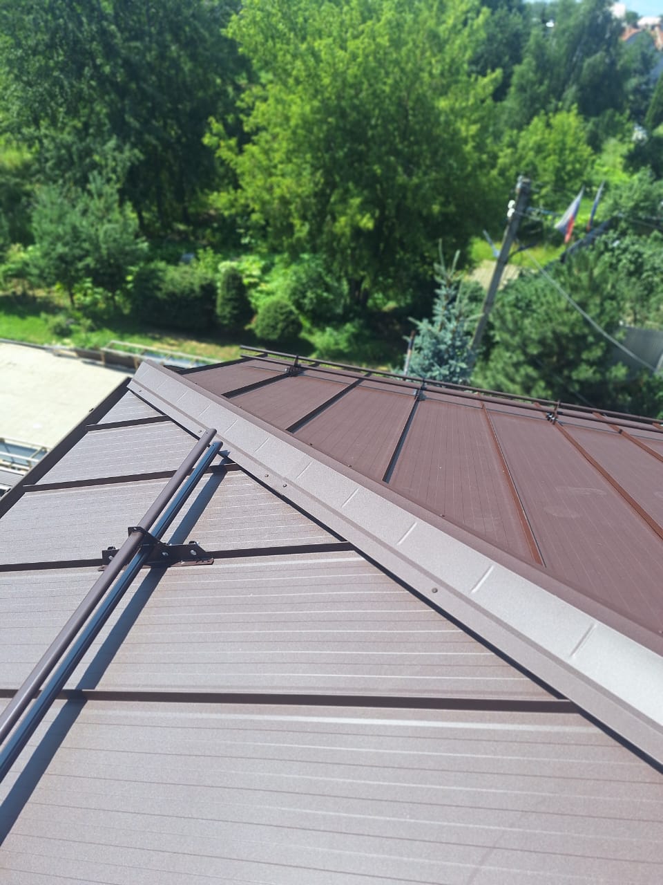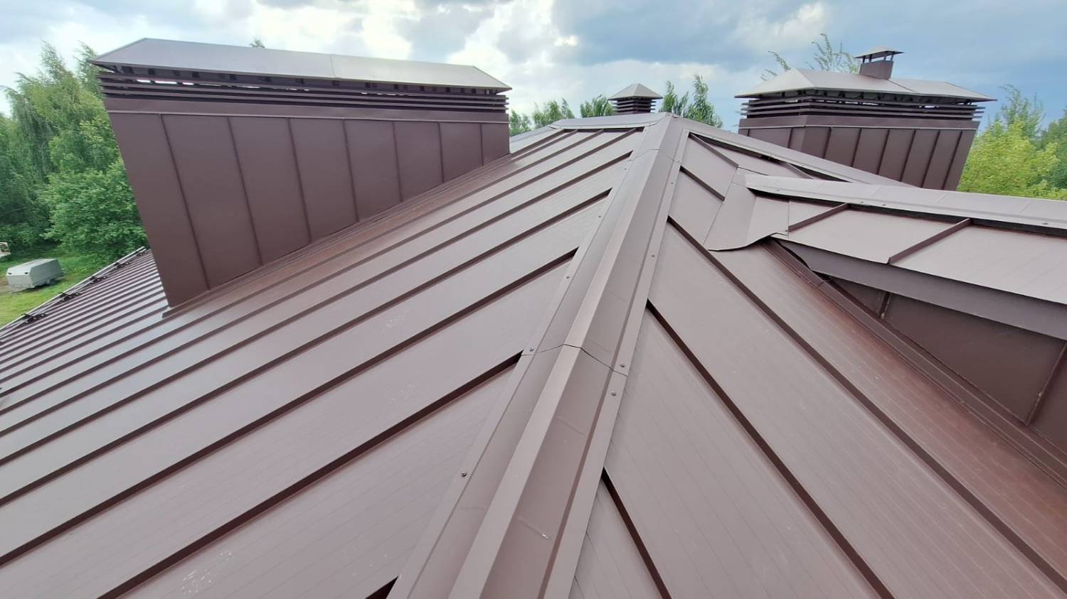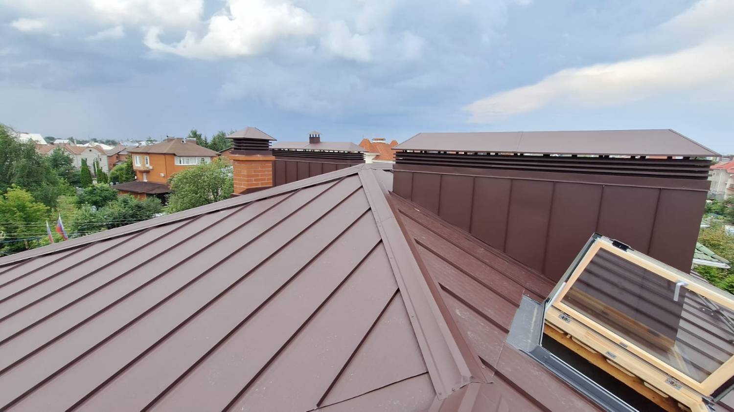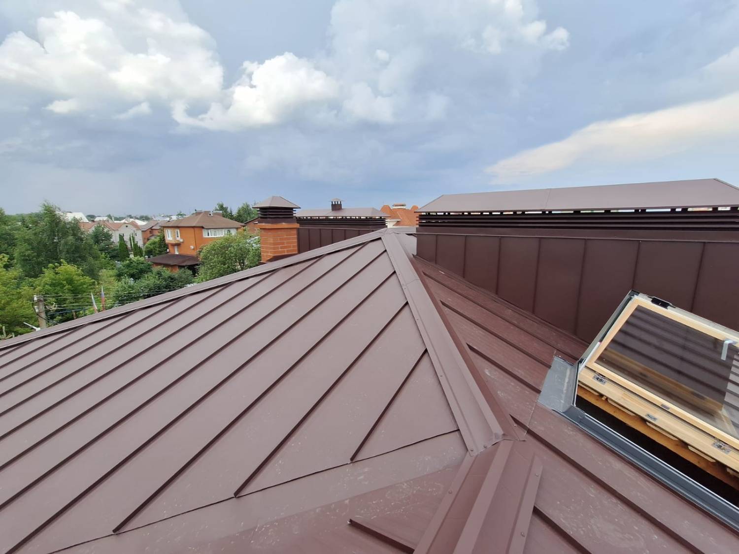 Комплексный монтаж кровли из двойного стоячего фальца RAL 8017 с установкой снегозадержателей Grand Line. Выполнен монтаж мансардных окон Fakro и обустройство вентиляционных выходов с индивидуальным изготовлением колпаков. Все работы проведены в полном соответствии с технологическими требованиями, что обеспечило надежность, герметичность и эстетичный внешний вид кровли.