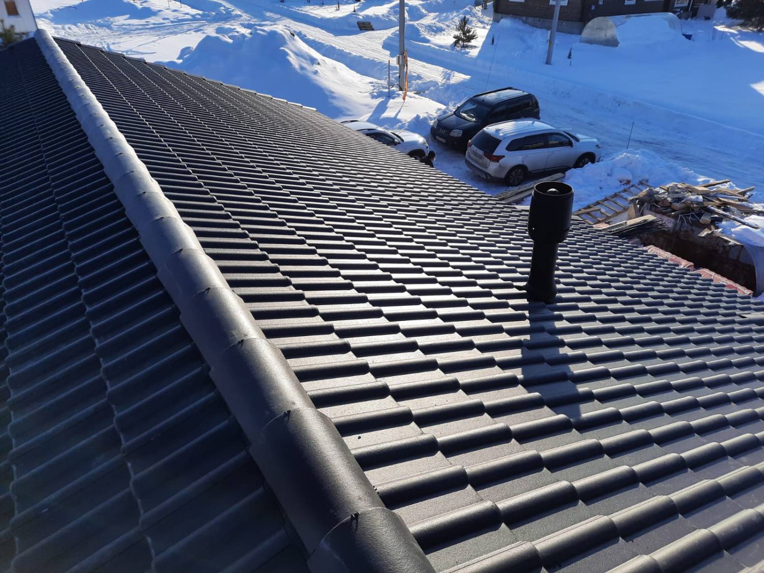Монтаж цементно-песчаной черепицы BRAAS Франкфурт (цвет чёрный) с обустройством вентиляции. Проведён комплекс кровельных работ с соблюдением всех технологических требований производителя. Кровля выполнена аккуратно и надёжно, отличается стильным внешним видом и обеспечивает эффективный воздухообмен под кровельным пространством.