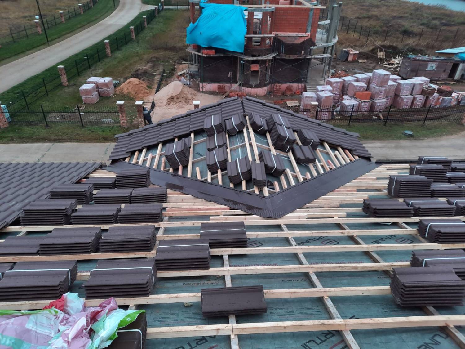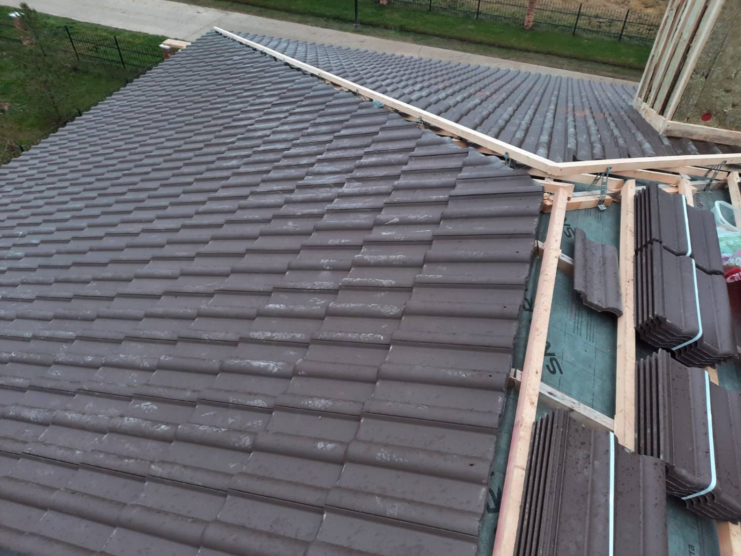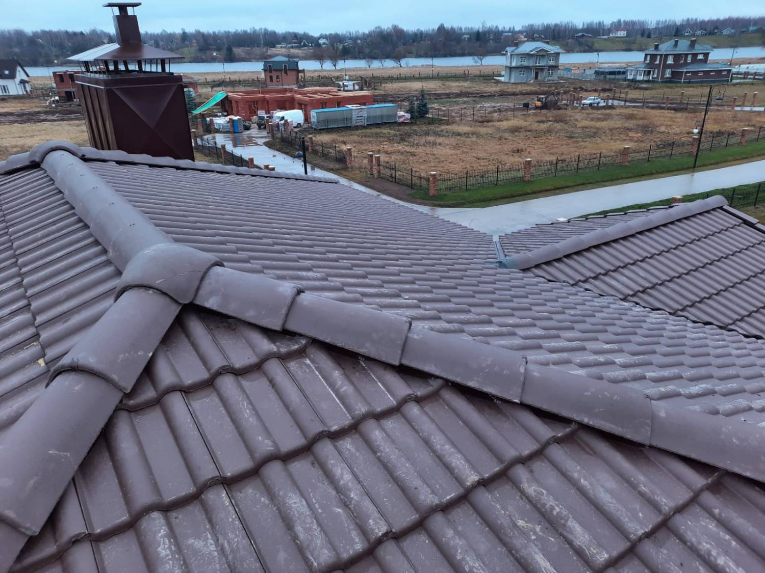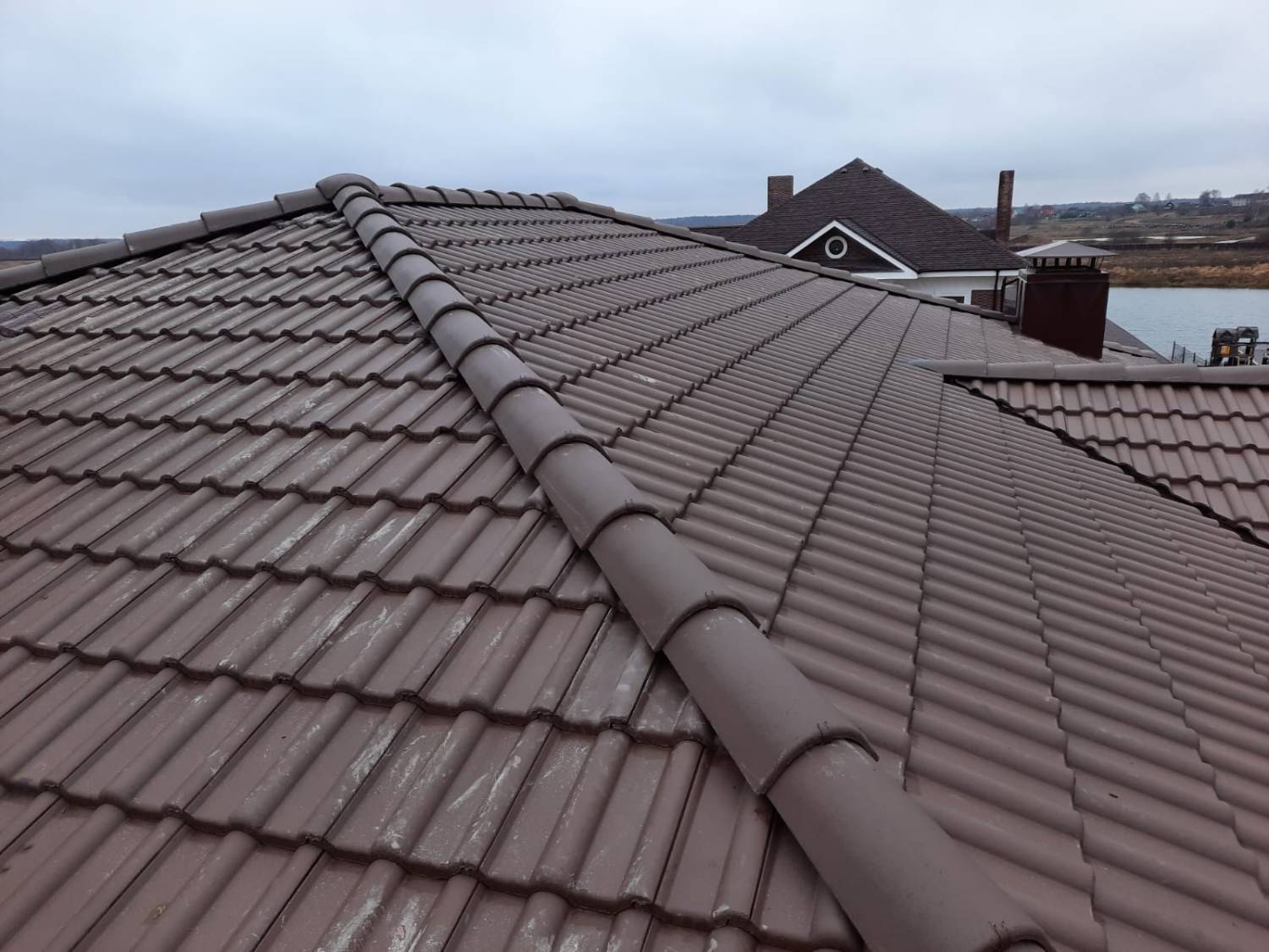 Монтаж цементно-песчаной черепицы BRAAS Франкфурт (цвет тёмно-коричневый). Выполнен полный цикл кровельных работ с соблюдением технологий производителя. Крыша получилась прочной, долговечной и эстетичной — гармонично сочетается с архитектурой дома и естественными оттенками фасада.