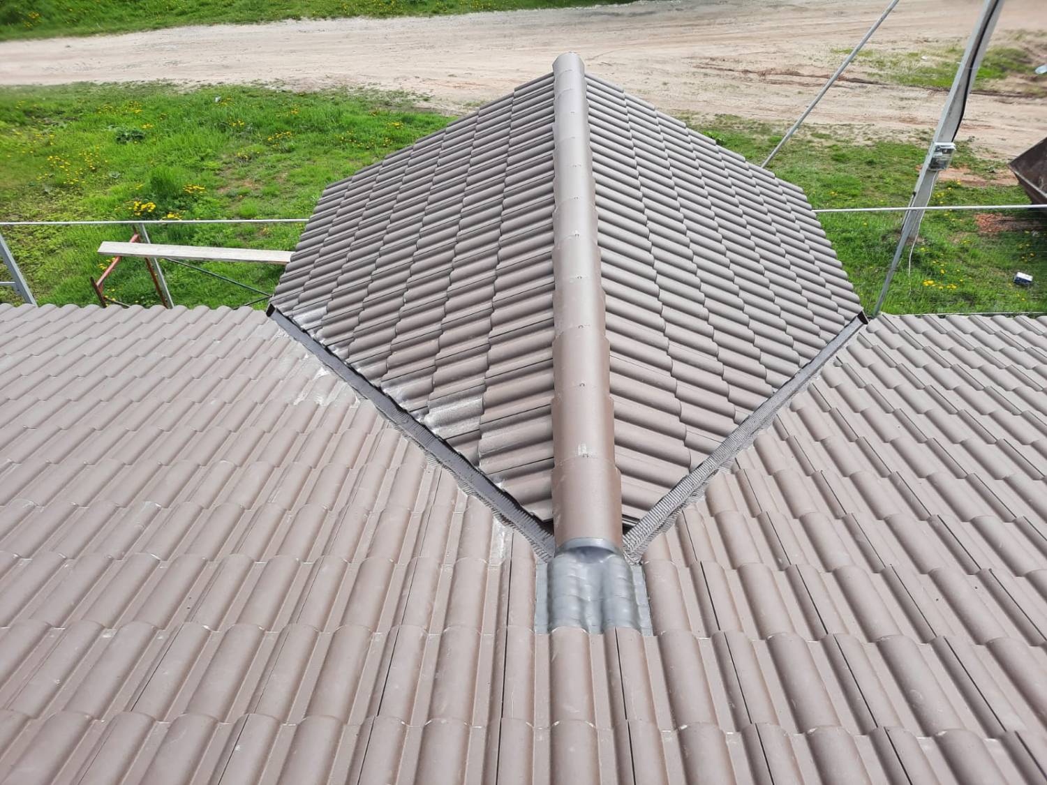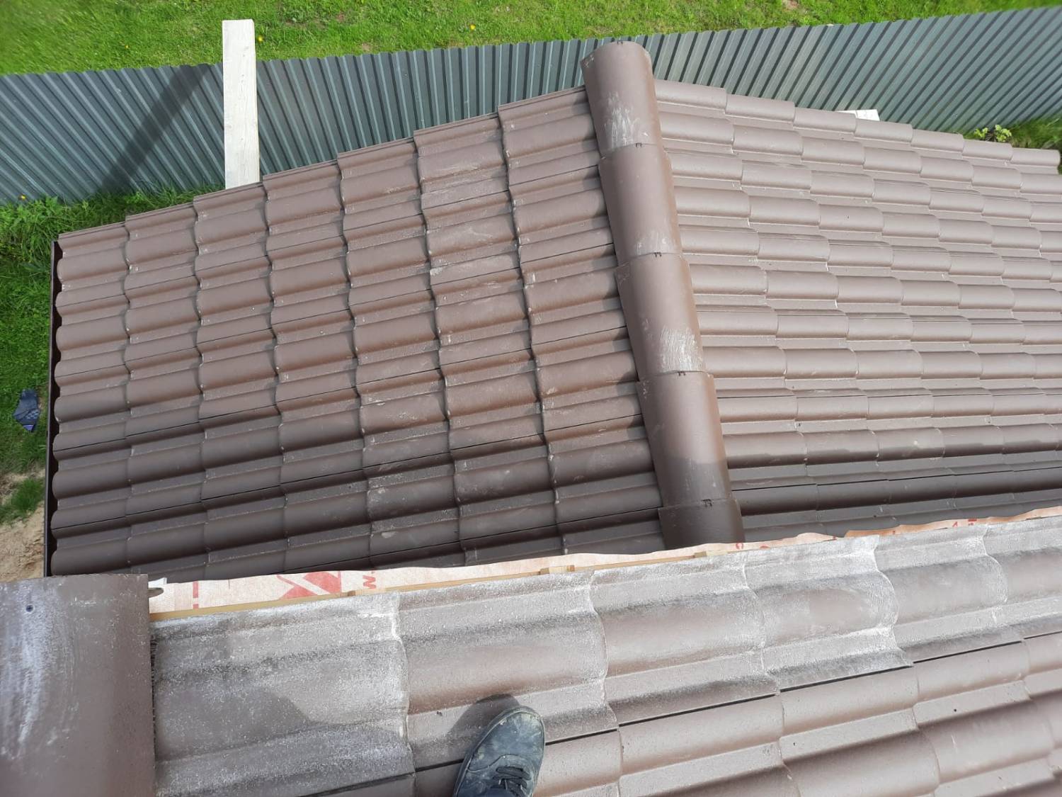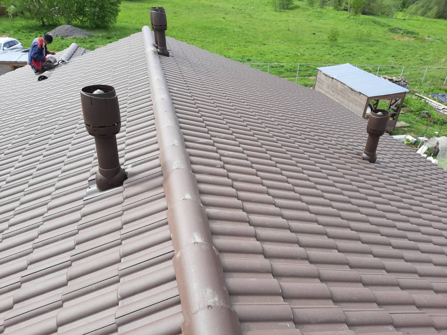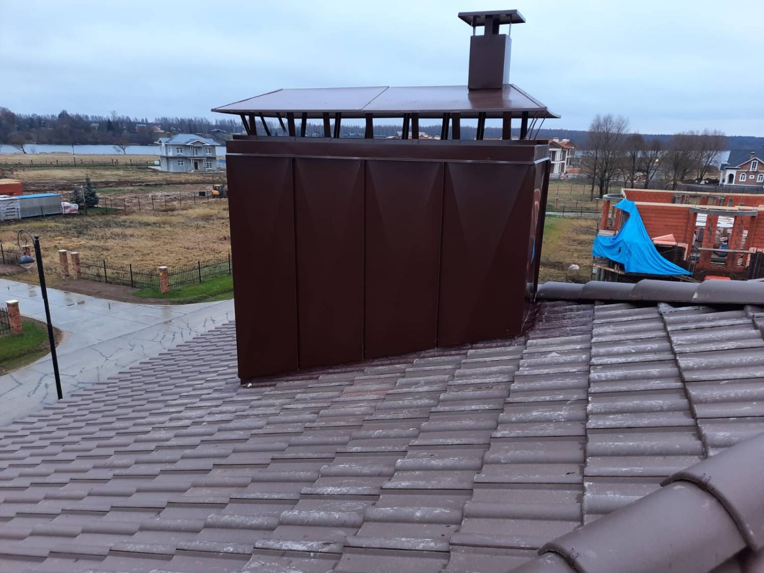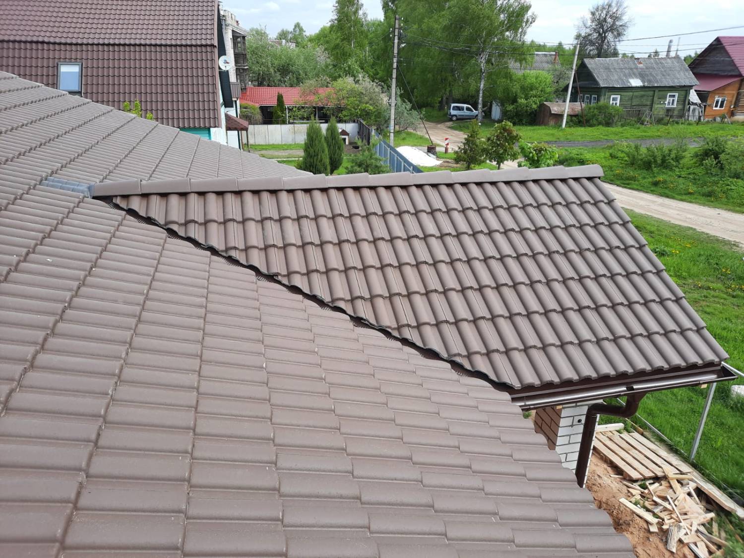 Монтаж цементно-песчаной черепицы BRAAS Франкфурт (цвет тёмно-коричневый). Выполнен полный цикл кровельных работ с соблюдением технологий производителя. Крыша получилась прочной, долговечной и эстетичной — гармонично сочетается с архитектурой дома и естественными оттенками фасада.